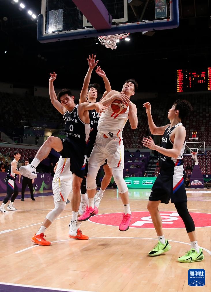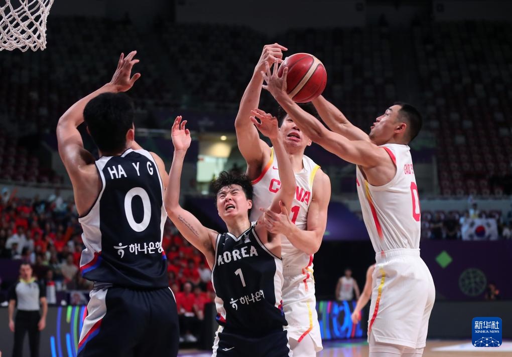 8月14日,中國隊球員高詩巖(右一)、余嘉豪在比賽中和韓國隊球員拼搶。