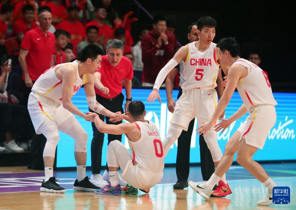 8月14日,中國隊球員朱俊龍(左一)拉起倒地的隊友高詩巖(左三)。
