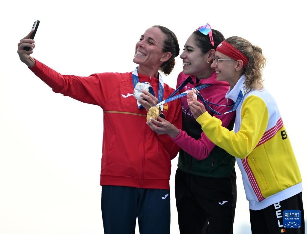 8月15日,亞軍西班牙選手巴羅·蘇維里、冠軍墨西哥選手阿爾瓦雷斯·科拉爾、季軍比利時選手杜邦(從左至右)在頒獎儀式上自拍。