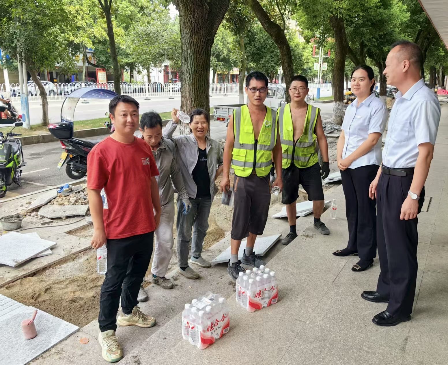 在赤壁市某路段施工現(xiàn)場,路政工人們身著反光背心,汗水浸透工作服,仍緊張進(jìn)行設(shè)施維護(hù)。中行赤壁支行工作人員快速響應(yīng),將成箱的礦泉水送至他們手中。一位工人感慨道:“高溫天戶外作業(yè)時間長,能及時喝上水太重要了。”