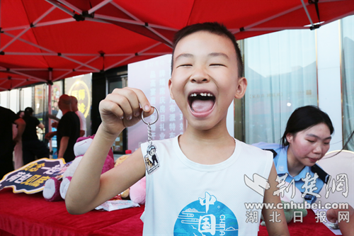 在反詐攤位前,“警察卡通”人偶成為熱門焦點,不少小朋友拉著家長駐足合影。民警適時引導,市民拍照后在朋友圈分享反詐宣言,即可領取反詐主題鑰匙扣,讓反詐知識在線上迅速傳播。