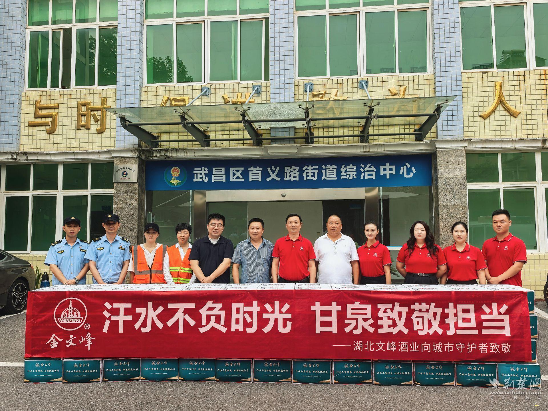 荊楚網(湖北日報網)訊(記者文放 通訊員全恒瑩)今夏以來,武漢持續遭遇高溫“烤”驗。在極端天氣下,武昌區首義路街道的環衛工人、城管執法人員等一線工作者依然堅守崗位,守護城市整潔與秩序。8月13日下午,在武昌區首義路街道辦事處的指導下,湖北文峰酒業武漢分公司開展“汗水不負時光,甘泉致敬擔當”公益活動,向轄區內的一線勞動者送上防暑降溫物資,傳遞企業的貼心關懷。