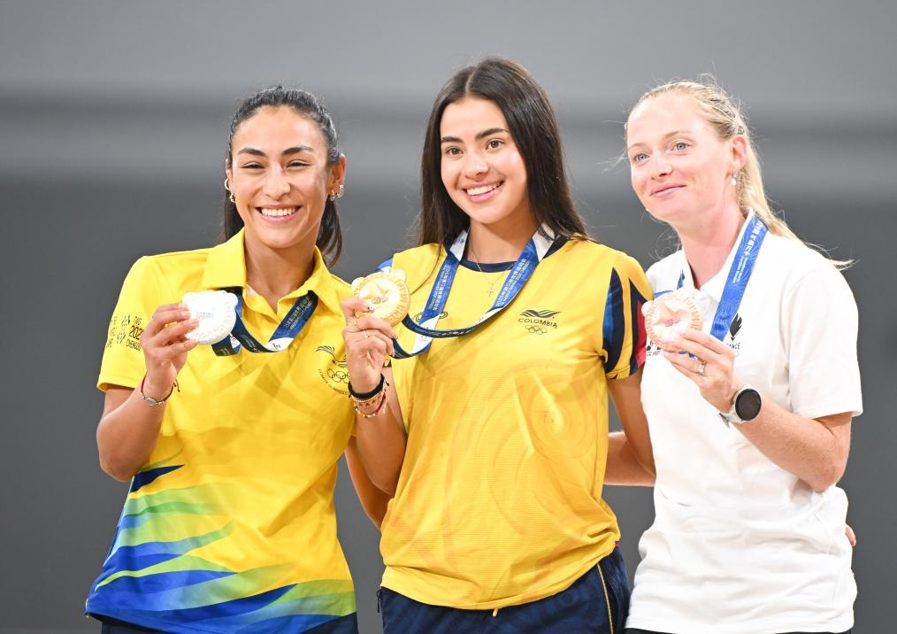 8月15日,冠軍哥倫比亞選手魯埃達(中)、亞軍厄瓜多爾選手巴爾加斯·薩緬托(左)與季軍法國選手勒弗夫爾在頒獎儀式上。