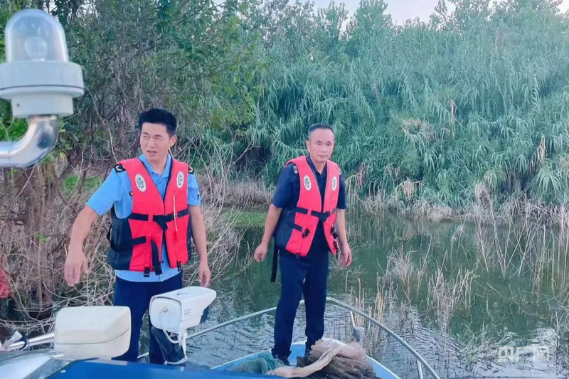 彭濤(左)正在長(zhǎng)江通江支流金水河水域巡護(hù)(央廣網(wǎng)發(fā) 江夏區(qū)農(nóng)業(yè)綜合執(zhí)法大隊(duì) 供圖)