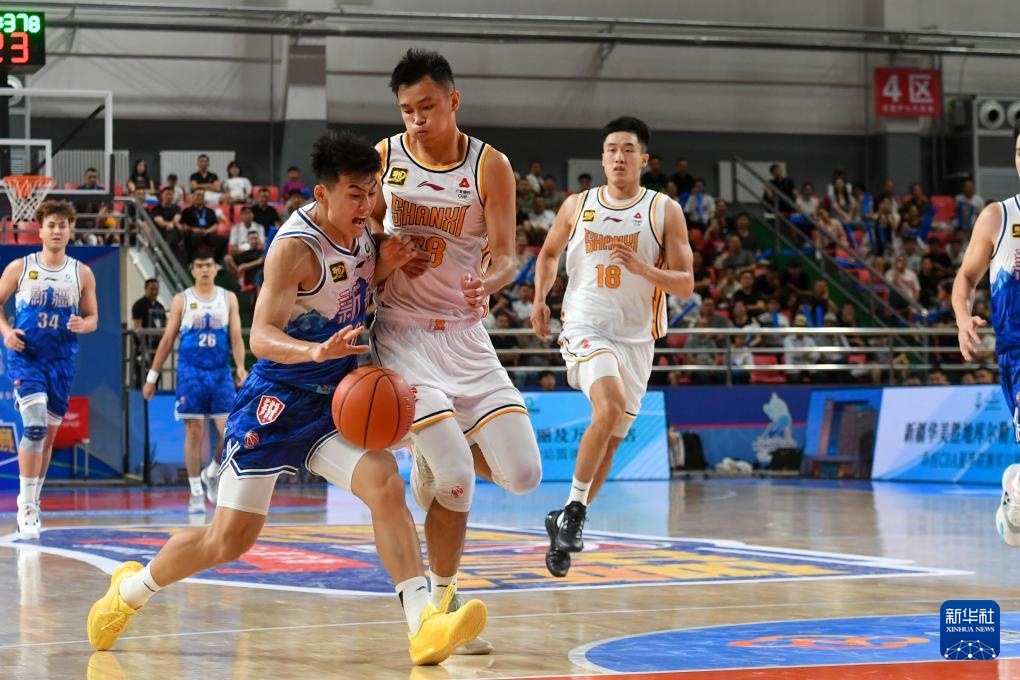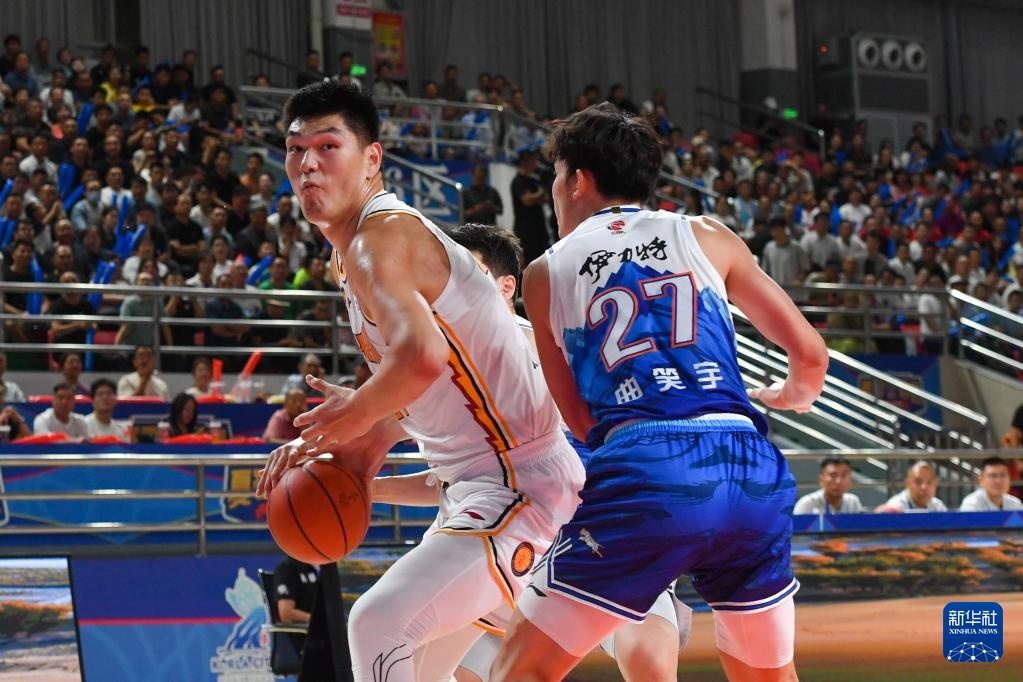 8月15日,新疆伊力特隊球員葛浩然(左一)在比賽中持球進攻。
