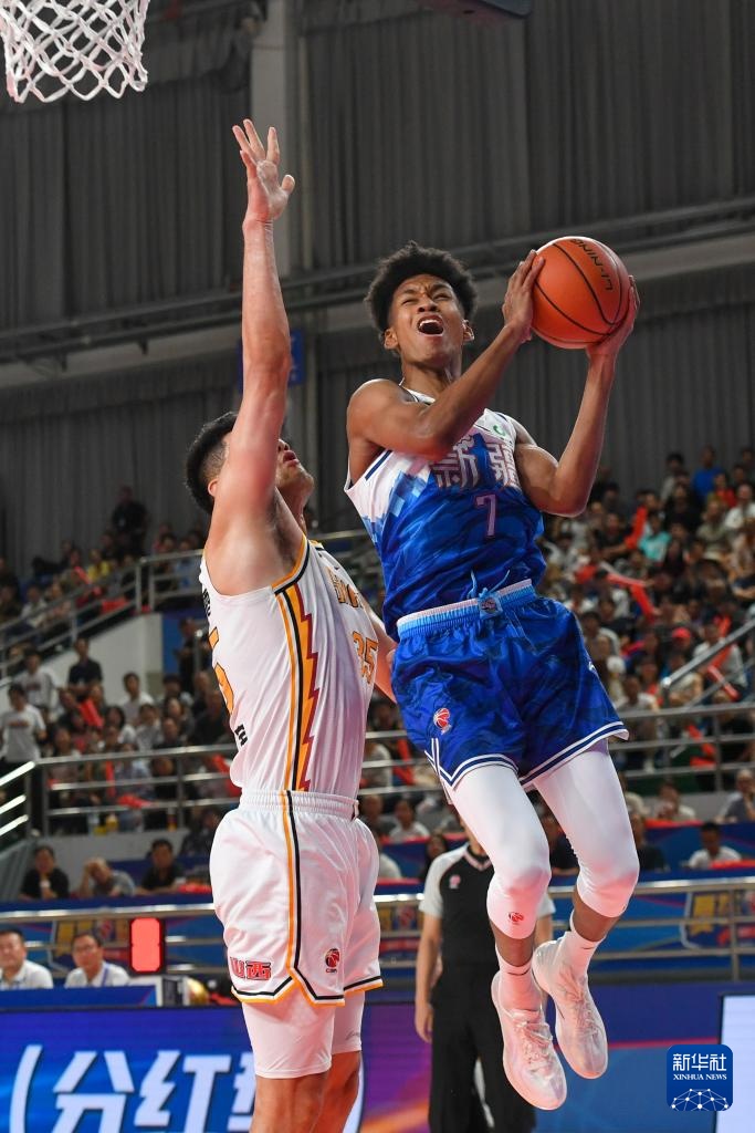 8月15日,新疆伊力特隊球員阿不都沙拉木(右)在比賽中投籃。