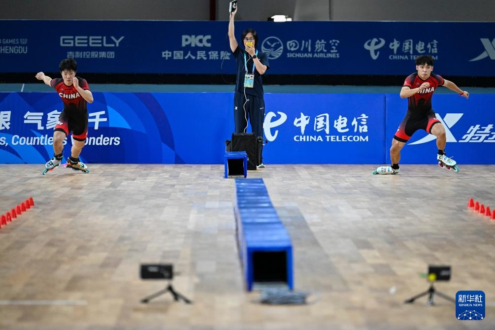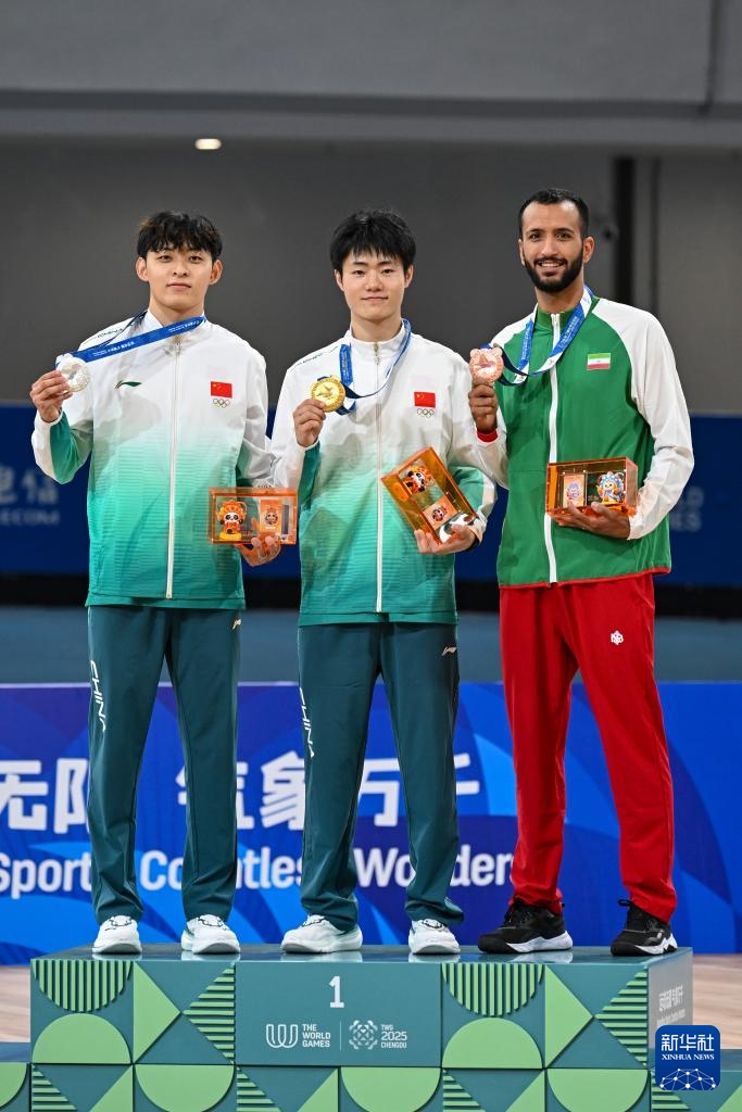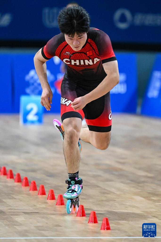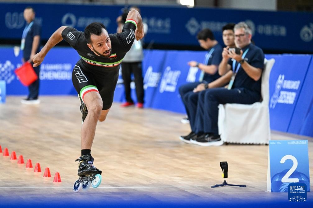 當日,在2025年成都世運會自由式輪滑男子速度過樁決賽中,中國選手張顥、付裕包攬冠亞軍,伊朗選手萊薩尼獲得季軍。