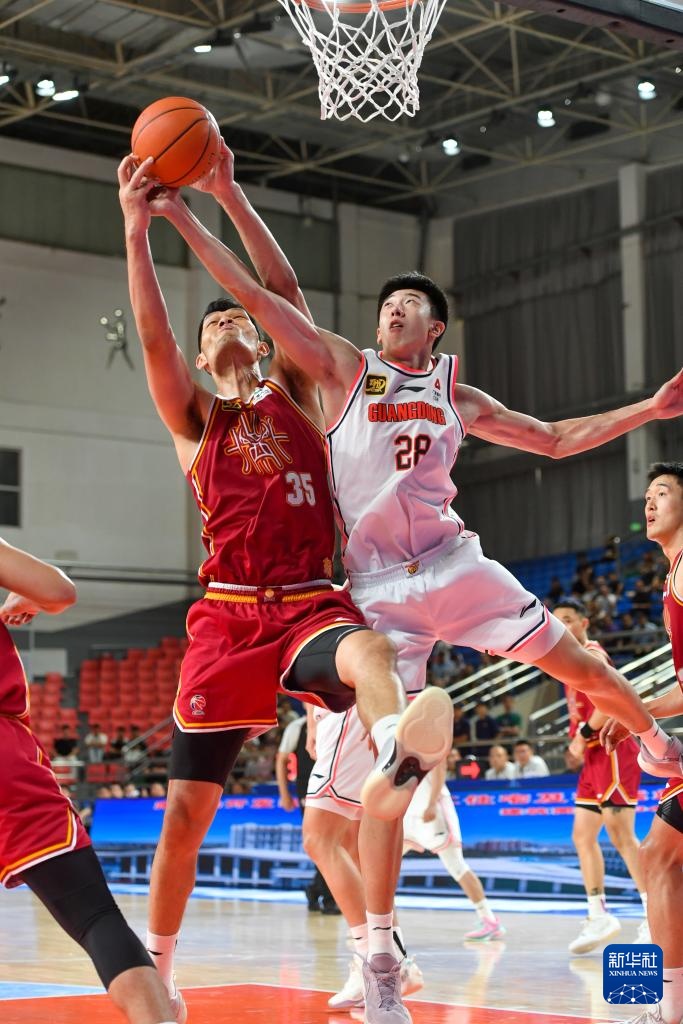 8月16日,廣東東陽光隊球員王少杰(左)在比賽中爭搶籃板。