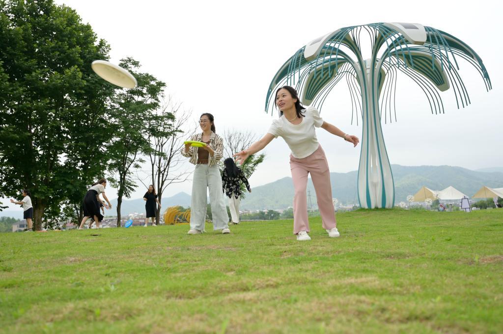 2023年6月5日,在浙江省湖州市安吉縣天荒坪鎮余村鄉村圖書館前,年輕人在草坪上玩飛盤。新華社記者 才揚 攝