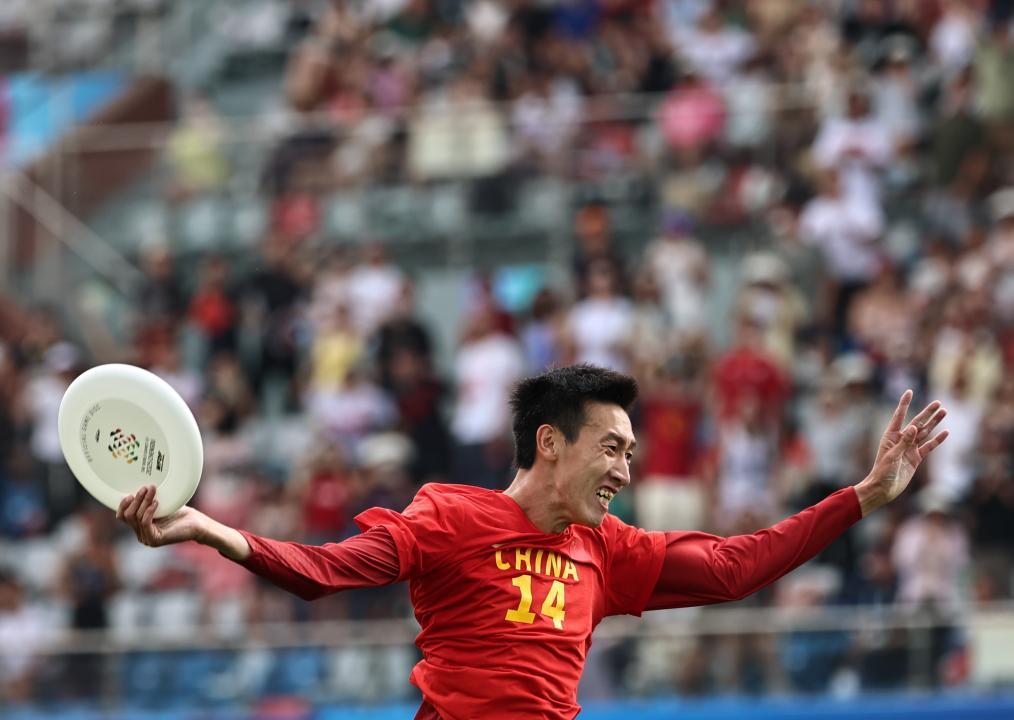 8月16日,中國隊選手徐穎異在比賽中接盤得分。當日,在2025年成都世運會團隊飛盤決賽第七名排位賽中,中國隊12:13不敵日本隊。新華社記者 孫凡越 攝
