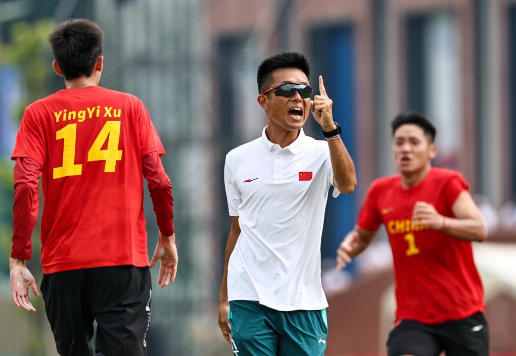 8月16日,中國隊教練何志豪(中)在比賽中鼓勵隊員。新華社記者 孫凡越 攝