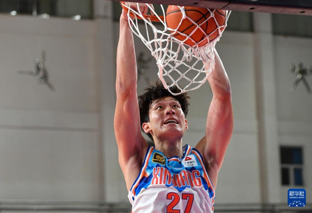 8月16日,新疆伊力特隊球員曲笑宇在比賽中扣籃。