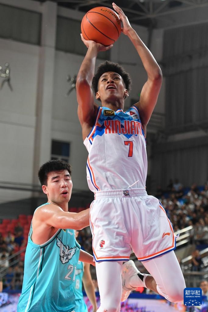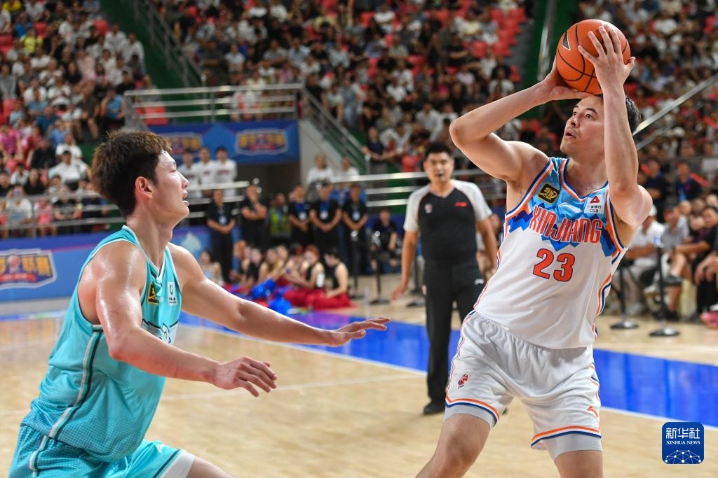 8月16日,新疆伊力特隊球員阿不都沙拉木(右)在比賽中投籃。