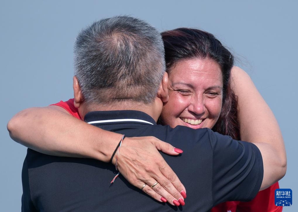 8月16日,法國選手博梅爾(右一)在比賽后與意大利選手欽齊婭(右二)擁抱。