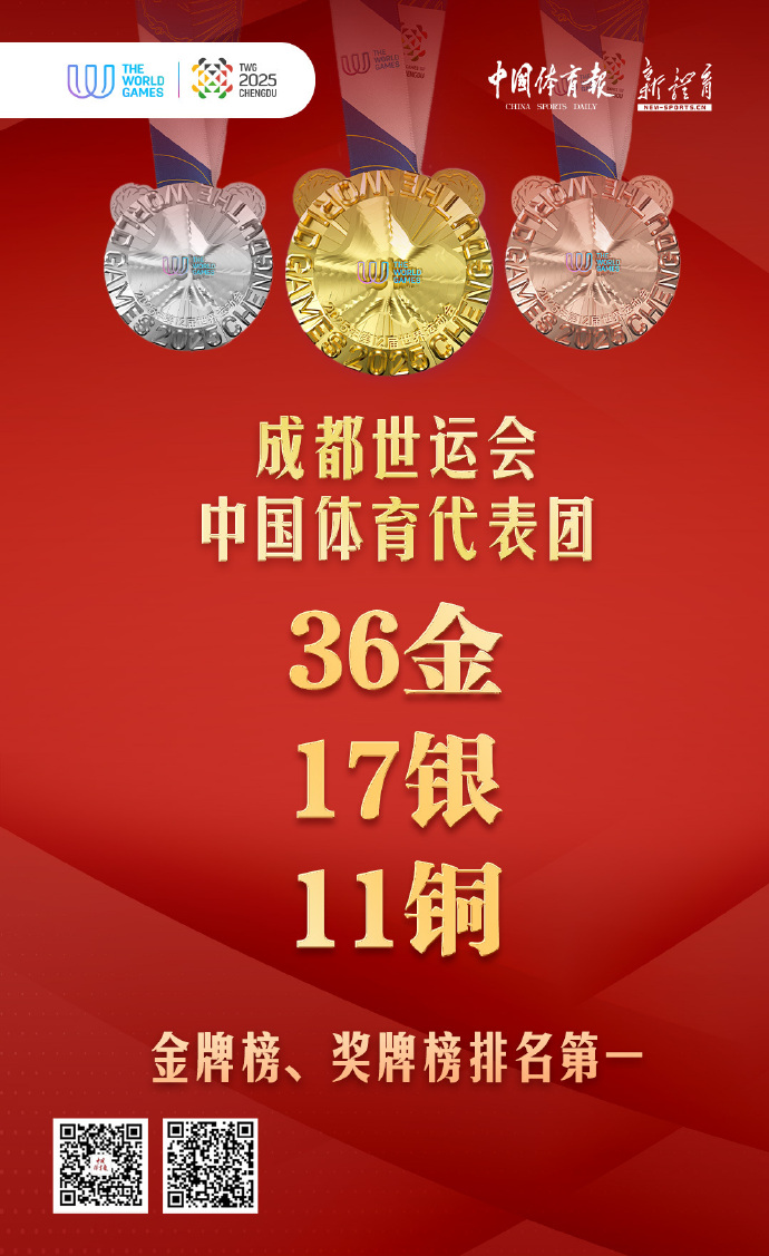 本屆成都世運會,中國隊收獲36金17銀11銅,共計64枚獎牌,圓滿收官。金牌榜、獎牌榜都是第一。