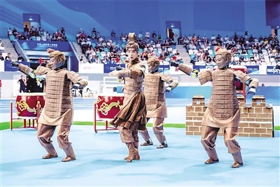 群體舞蹈比賽中,9臺由光谷東智研發(fā)的“光子”人形機(jī)器人與1名舞者共舞《秦俑魂》。舞者飾演“將軍俑”,“光子”則身披3D打印秦俑戰(zhàn)甲化身“兵俑”,或敲響絳州大鼓,或跟隨節(jié)奏跳舞并變換隊形,展現(xiàn)“將軍擊鼓,率兵奮戰(zhàn)”的氛圍。