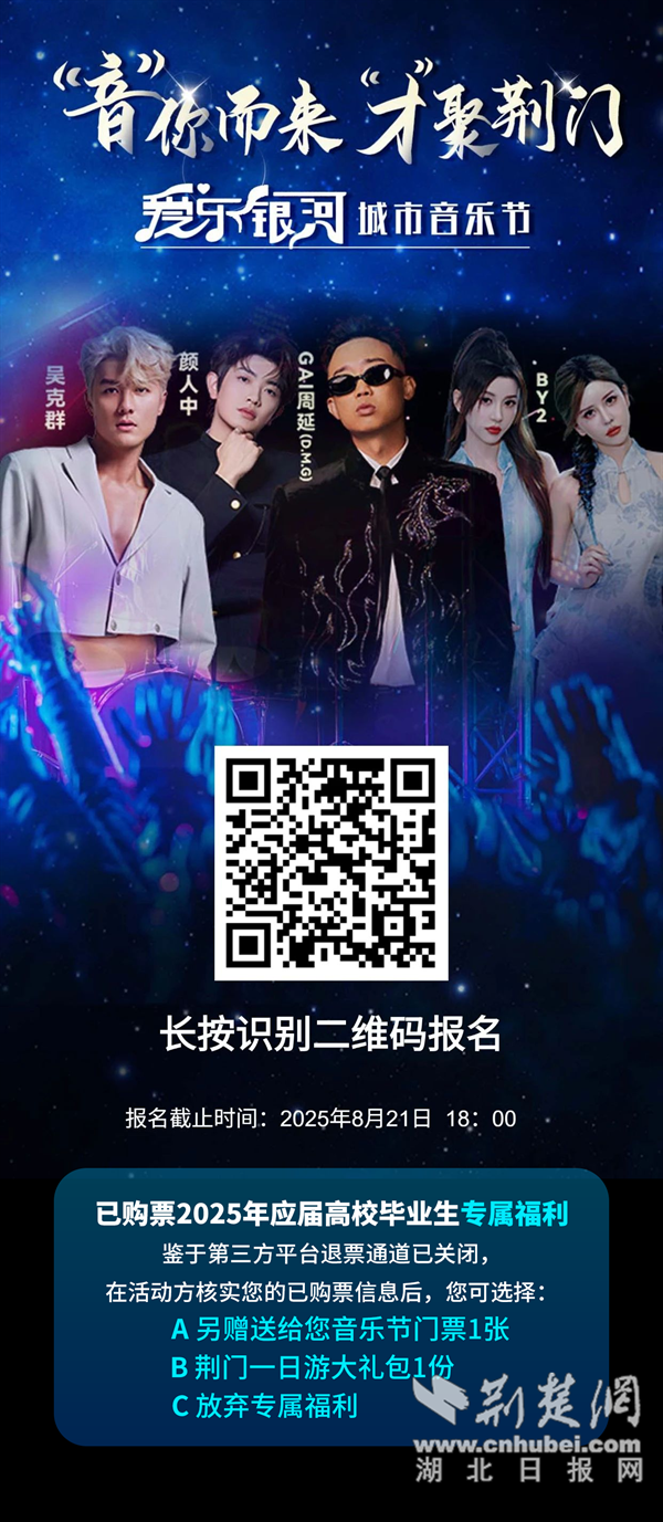 據悉,荊門人才辦將為2025年高校應屆畢業生,贈送一張音樂節入場卷,讓青年學子在在音樂中告別校園,名額有限,即日可以通過掃描下面二維碼報名。