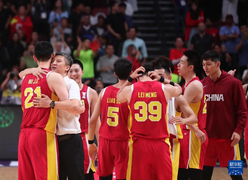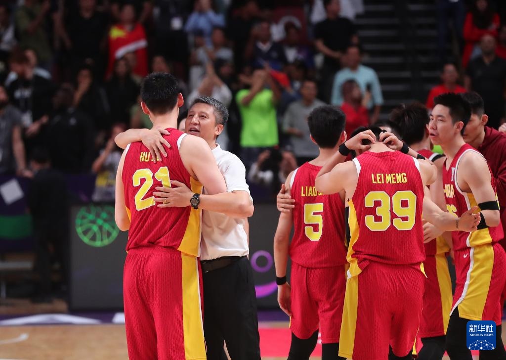8月17日,中國隊主教練郭士強(左二)賽后擁抱隊員胡金秋。