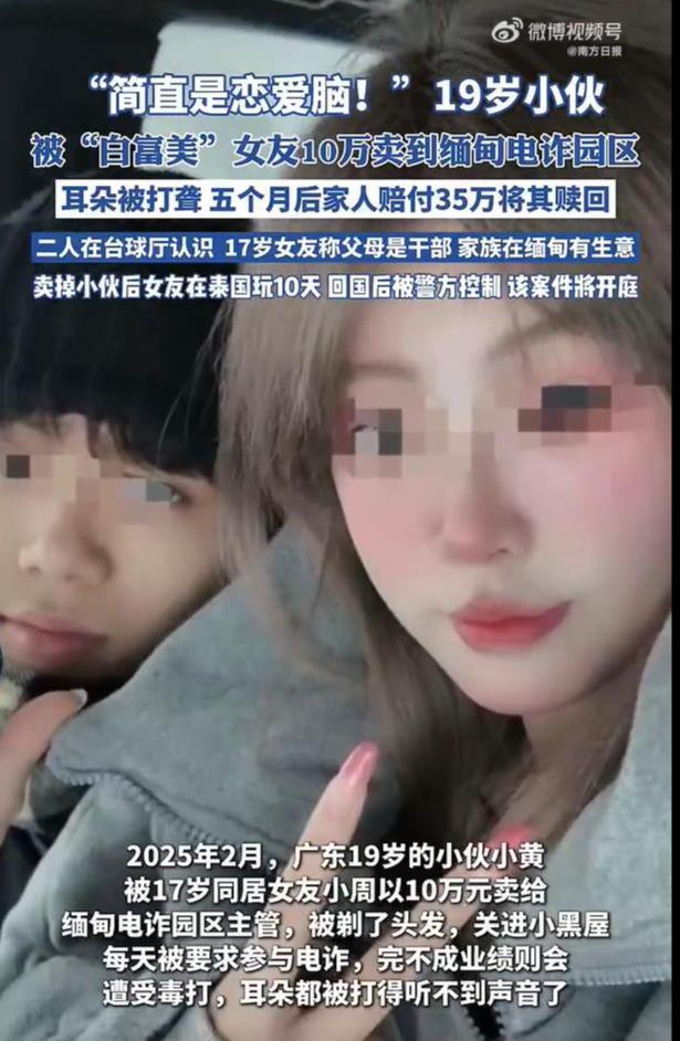 2025年2月,廣東19歲的小伙小黃,被17歲同居女友小周以10萬元賣給緬甸電詐園區(qū)主管,四個月時間里,小黃在電詐園區(qū)完不成業(yè)績就會遭受毒打,耳朵都被打得聽不到聲音了。8月17日,記者聯(lián)系到了小伙的姐姐黃女士,其講述了弟弟被騙到緬甸的詳細經(jīng)歷,她希望更多年輕人能夠以弟弟為誡,提高警惕,避免被騙。(據(jù)8月18日南方日報)