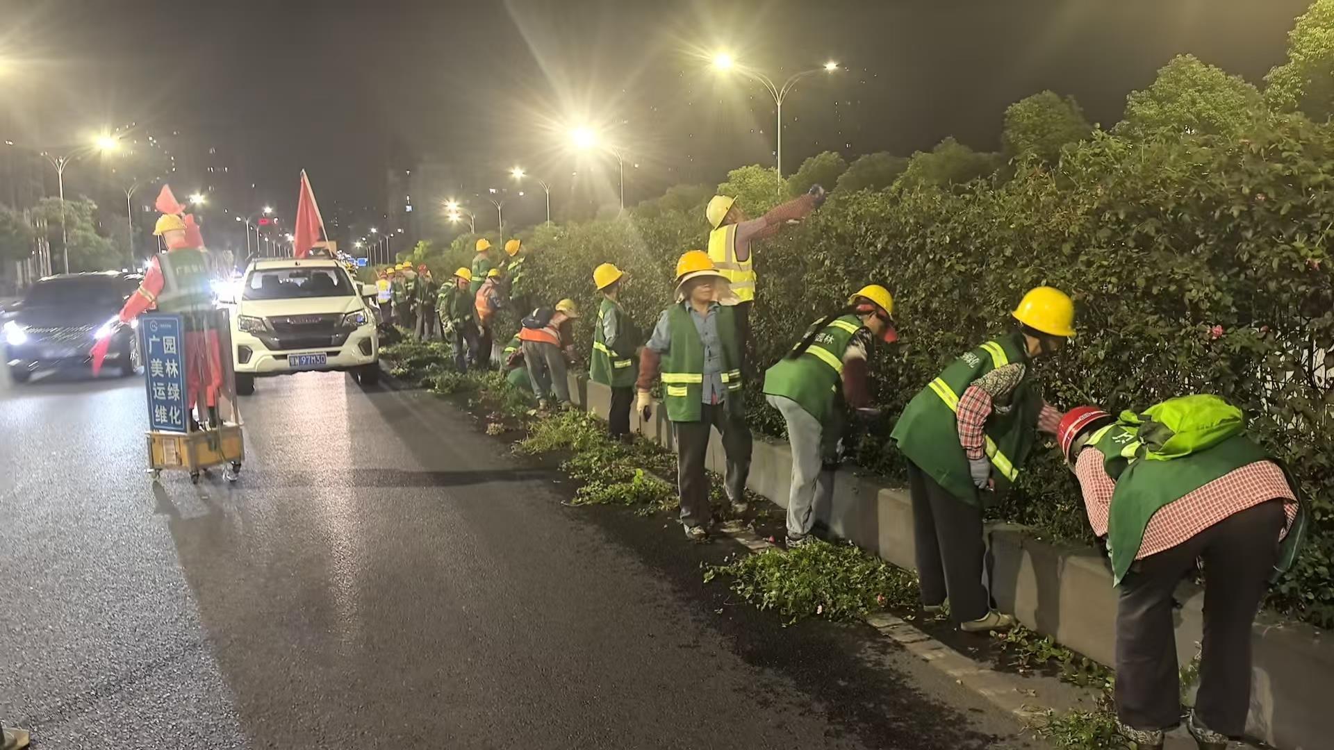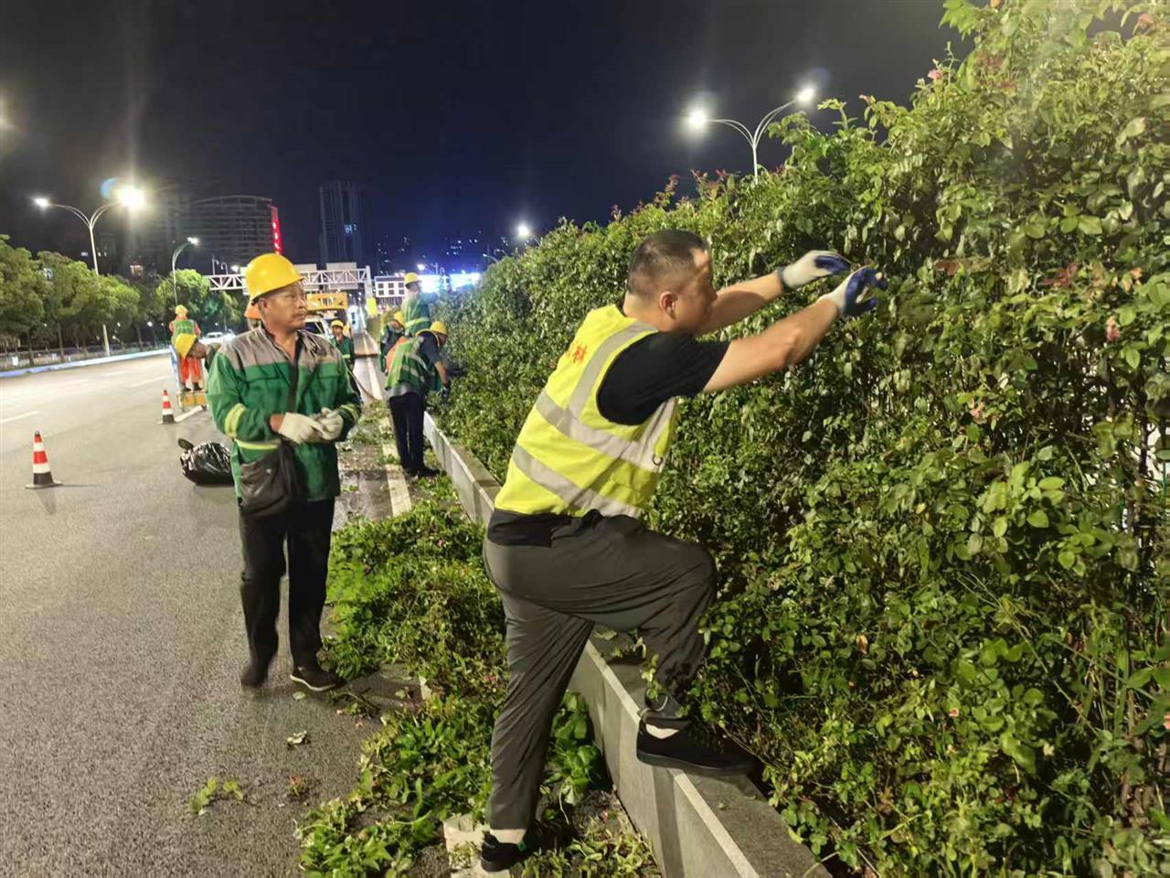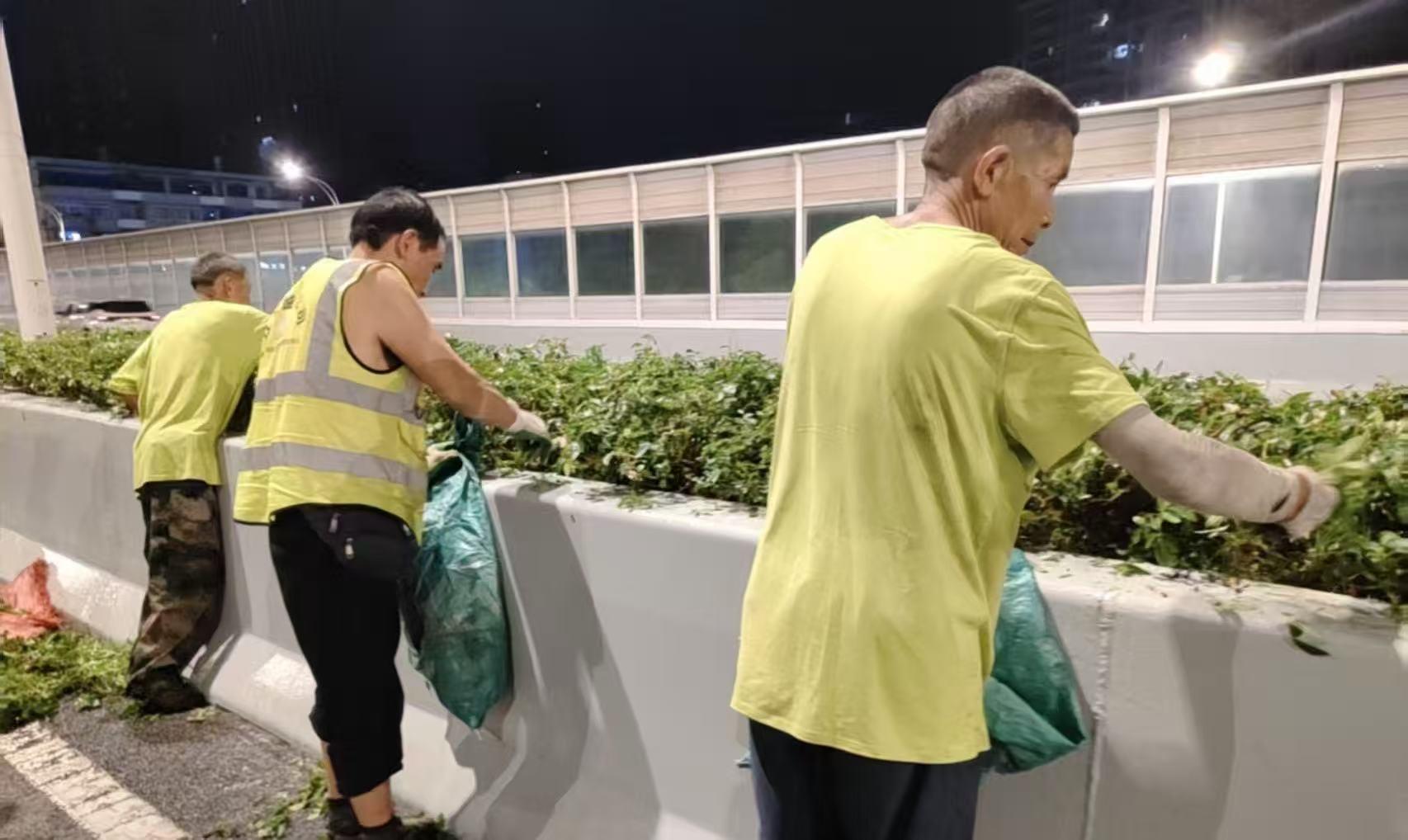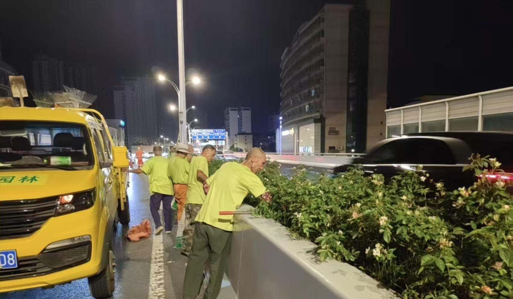 隨車潛入夜,修物細無聲。從上周五夜間開始,您如果路過武漢一些高架橋,會發現一群身著綠馬甲的園林師傅們,正手持剪刀修剪路中央的月季。