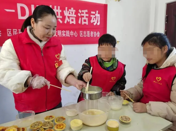 王冬蘋和孩子們一起做蛋糕。(掇刀區融媒體供圖)