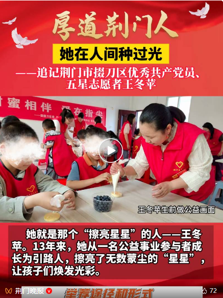 王冬蘋生前是掇刀區志愿者協會秘書長,她深耕公益13載,累計組織關愛活動200余場,關愛幫扶留守兒童、困境兒童、流動兒童1000余人,志愿服務時長超8000小時。她用生命的光與熱,拂去了特殊兒童心頭的塵埃,溫暖了這座城市。王冬蘋先后榮獲荊門好人、荊門市文明市民、荊門市五星志愿者、荊門市十佳優秀志愿者、荊門市道德模范、湖北省優秀志愿者等榮譽稱號。