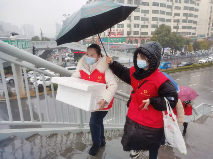 王冬蘋送生活物資。(掇刀區融媒體供圖)
