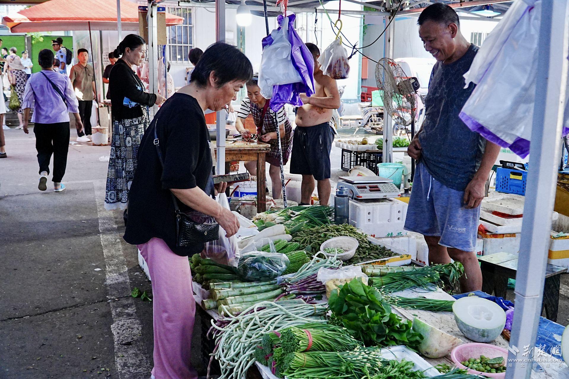 走進“瑞景便民菜市場”,攤位整齊劃一,買賣聲熱鬧,卻不見雜亂。菜薹基地負責人夏會勇介紹:“我們每天有管理員現場巡查,結束后統一清掃,確保干凈整潔。”