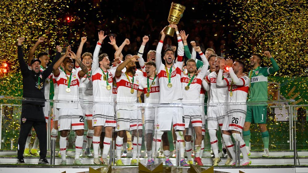 5月24日,斯圖加特隊成員在2024-2025賽季德國杯頒獎儀式上慶祝奪冠。新華社發(烏爾里希·胡夫納格爾 攝)