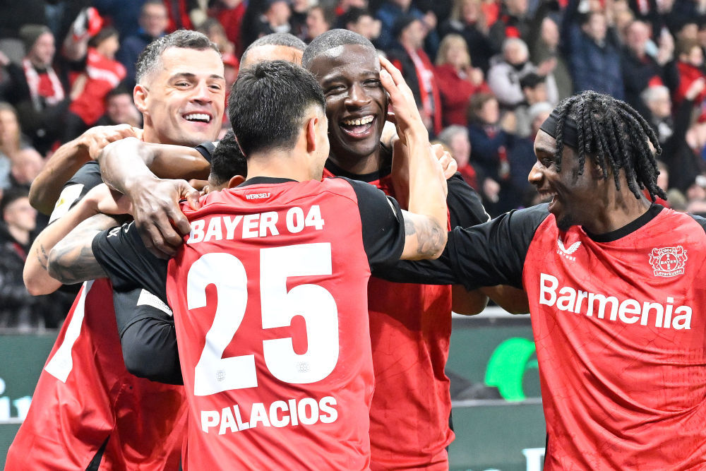 3月28日,勒沃庫森隊球員在2024-2025賽季德國足球甲級聯賽第27輪比賽賽后慶祝獲勝。新華社發(烏爾里希·胡夫納格爾攝)