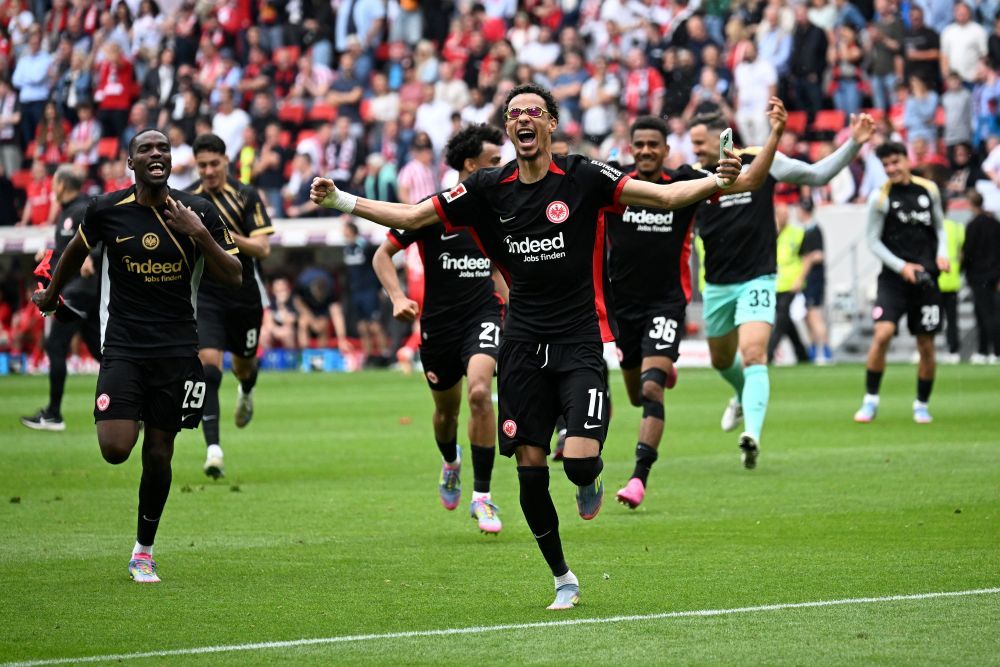 5月17日,法蘭克福隊球員在2024-2025賽季德國足球甲級聯賽第34輪比賽后慶祝勝利。新華社發(烏爾里希·胡夫納格爾攝)