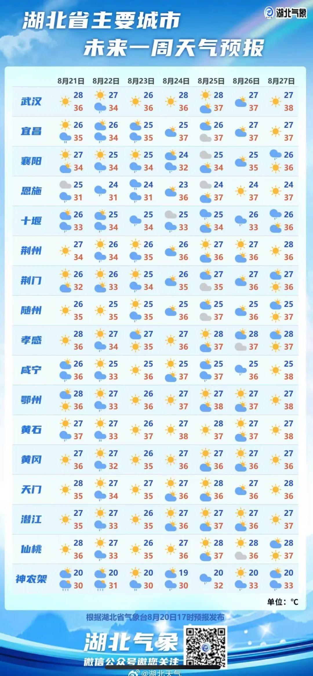 后天(22日)湖北大部地區(qū)高溫基本熄火:預計最高氣溫恩施地區(qū)27-32℃、其他地區(qū)32-36℃。