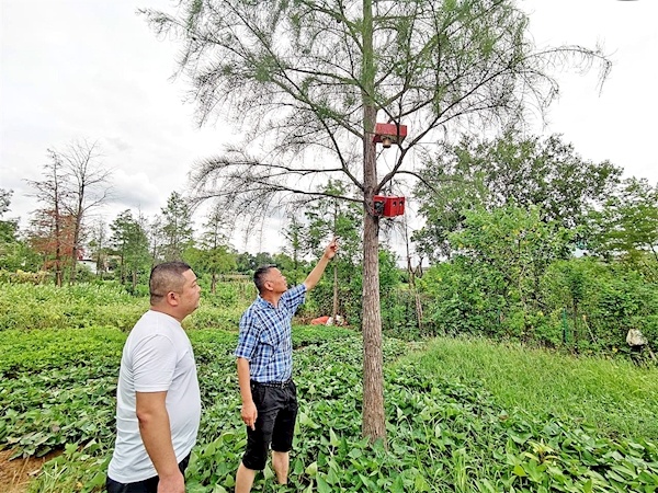 說話間,菜園的一棵樹上,突然傳出老鷹的叫聲,隨后依次傳出槍炮聲、貓叫聲和吼叫聲。抬頭望去,只聽到些聲音,是從樹上的一個帶有太陽能板的白色裝置中發出的。此時的菜園上空,不見鳥飛甚至聽不到鳥鳴。