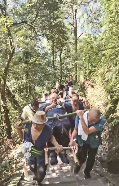 方先生說,考慮到對方體重超重,為保證安全,他們最后安排了9人輪流抬滑竿?!耙驗檫@名游客是臨時聯系的,我先找來兩乘滑竿,不過,因為游客身體過于龐大,都坐不進去。最后又聯系到一乘大滑竿,才勉強坐進去?!?/p>