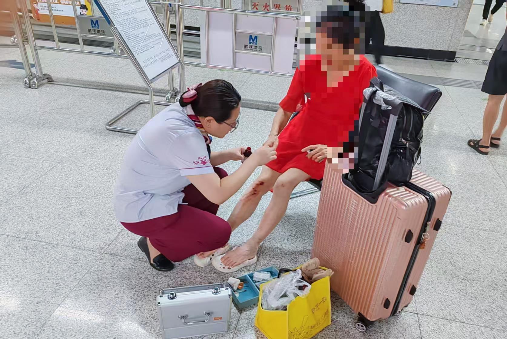 一段時(shí)間后,周卓斌的同事黃磊也趕到了現(xiàn)場(chǎng)。兩人分工合作,周卓斌將老人攙扶至休息椅上休息,并守護(hù)在其身旁,黃磊則呼叫地鐵工作人員攜帶醫(yī)藥箱趕到現(xiàn)場(chǎng)救治。