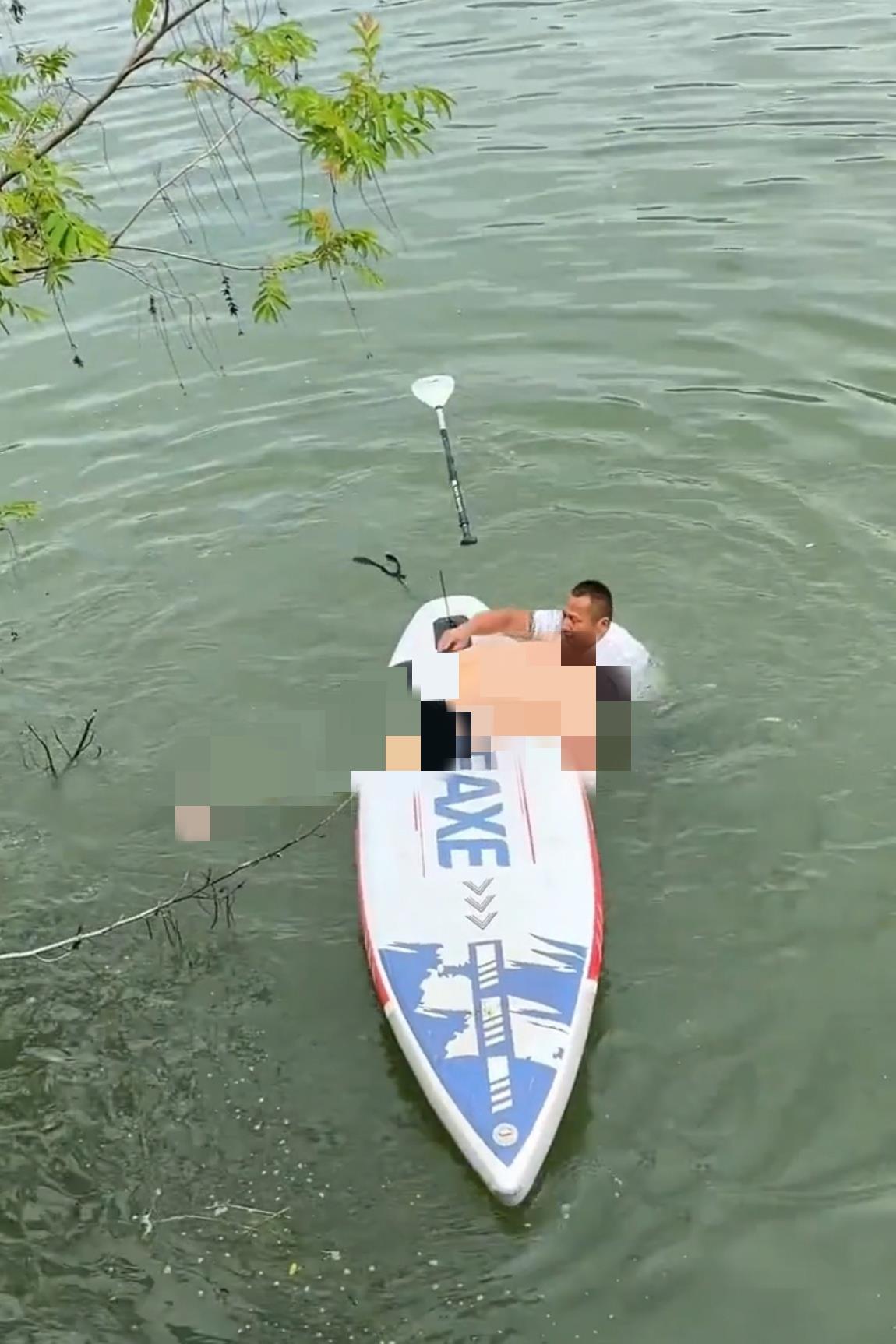 視頻顯示,一男子溺水臉朝下漂在水中沒有動靜,一名施救者劃著槳板快速來到男子身邊,雙手抓住男子胳膊,然后下到水中,利用自身后仰的重量將槳板翻了個面,溺水者正好躺上了槳板,但頭面部仍沉在水中,因為在水中操作十分困難,在調整過程中溺水者又溜下了槳板。這時,有人趕來丟下了一個救生圈。施救者將其套到溺水者身上,這才被岸邊的人拉了上來。