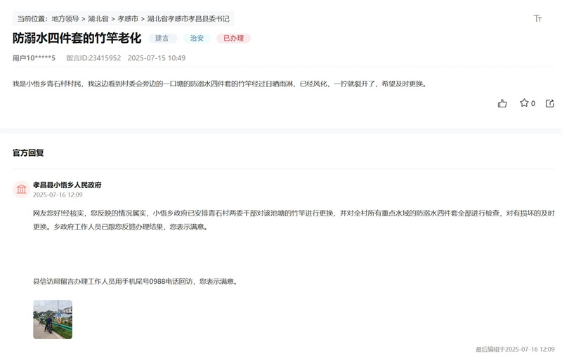 “村委會旁池塘的防溺水竹竿裂了,希望及時更換。”7月15日,孝昌縣小悟鄉青石村村民留言稱。