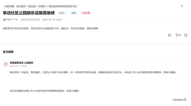 “社區公園的秋千有一端松動,存在安全隱患,請核實維修。”7月16日,孝昌縣季店鄉季店社區居民留言反映安全隱患。