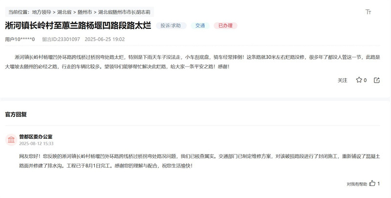 人民網武漢8月23日電 (記者張雋)近日,湖北網民通過人民網“領導留言板”反映身邊急難愁盼,涉及安全設施、道路通行、公共娛樂等領域,相關部門快速核查、高效處置,將“民生小事”辦實辦好,獲得網民認可。