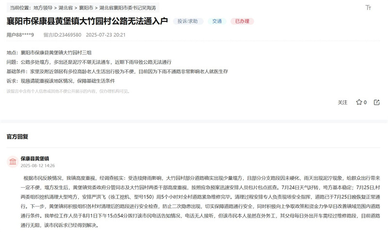 黃堡鎮黨委政府引起重視,7月24日,天氣轉好時核查路況,7月25日組織人員清理塌方土石、平整路面,用時5小時完成道路維修,當晚恢復通行。后續黃堡鎮繼續排查清理后路段防二次隱患,并爭取政策資金改善鎮域道路條件。目前道路通行無阻,市民訴求已得到解決。