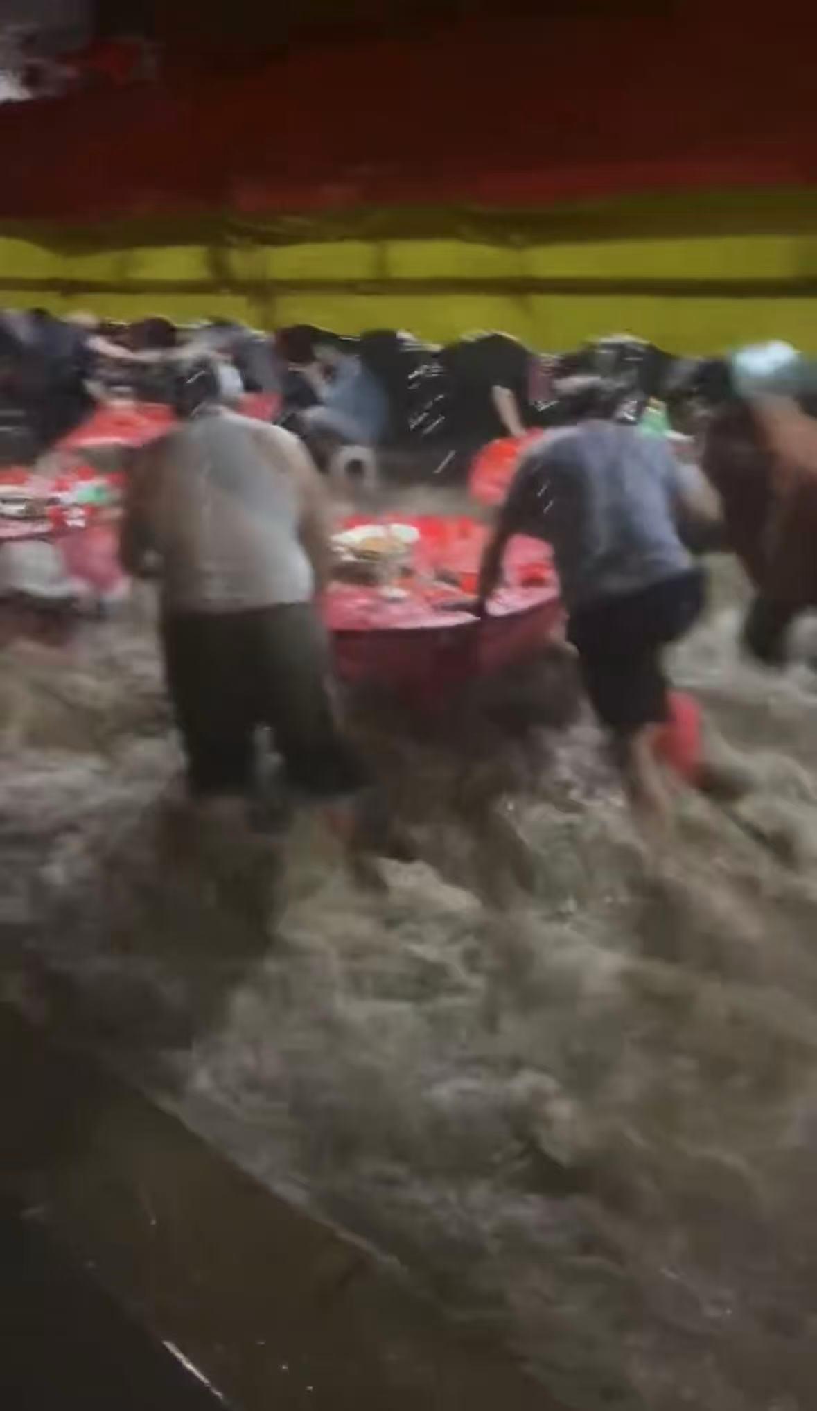 從網友發布的現場視頻和圖片來看,當晚看寺村雨勢猛烈,積水深達成年人膝蓋。畫面中可見部分椅子被水沖走,也有村民在雨中滑倒,現場多人正緊急搬運和轉移桌椅。
