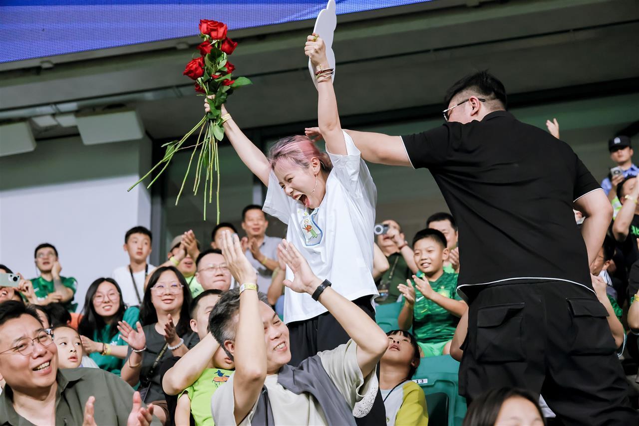 目睹這一幕的現場球迷,紛紛將手機鏡頭對準看臺上的“老李”。來看個球,突然成為全場焦點,老李錯愕之余,激動地完全說不出話。他不停地向女友點頭回應,并鞠躬感謝現場球迷的祝福,現場尖叫聲、歡呼聲不斷。當女生和男生一起回到座位時,大家紛紛向他們道喜。女生邊走邊振臂高呼:“成功了!耶!”這一刻,球場也從緊張刺激的氛圍變得無比溫馨浪漫。
