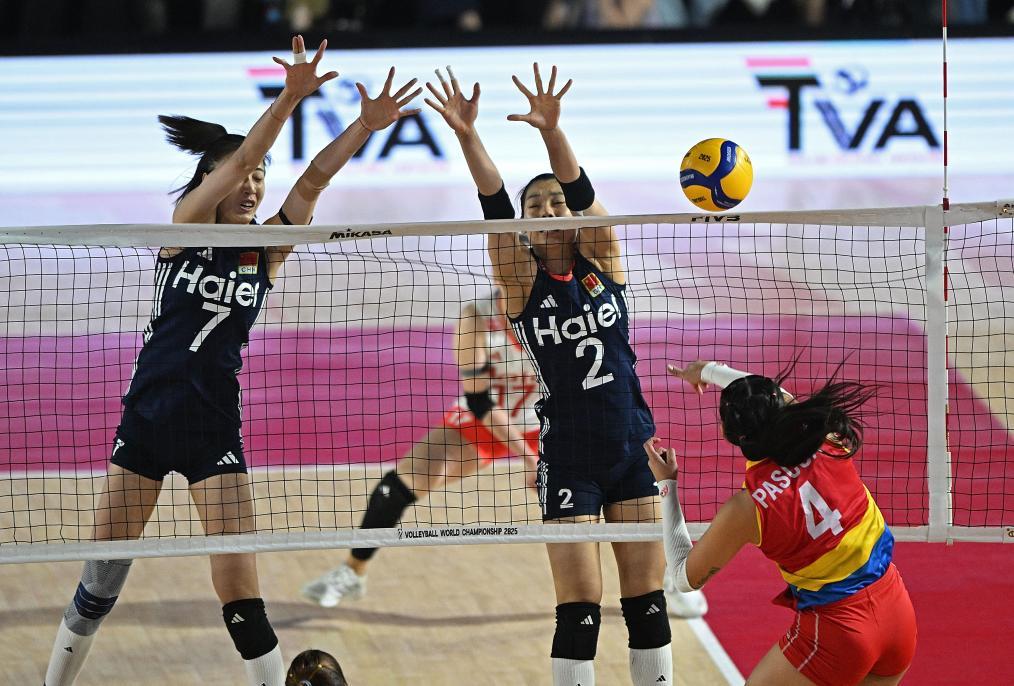 8月25日,中國隊球員王媛媛(左)和莊宇珊(中)在比賽中攔網。新華社記者 侯昭康 攝