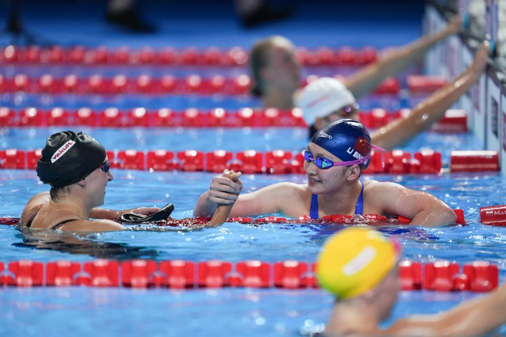 7月27日,中國選手李冰潔(右中)在比賽后與美國選手萊德茨基握手致意。當日,2025年世界游泳錦標賽女子400米自由泳決賽在新加坡舉行。新華社記者 伍志尊 攝