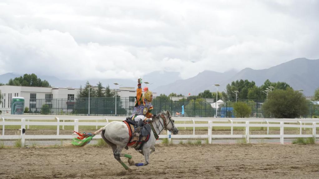 8月24日,西藏自治區(qū)馬術(shù)隊(duì)隊(duì)員旦增尼瑪在進(jìn)行“馬上敬酒”表演。 新華社記者 黃耀漫 攝