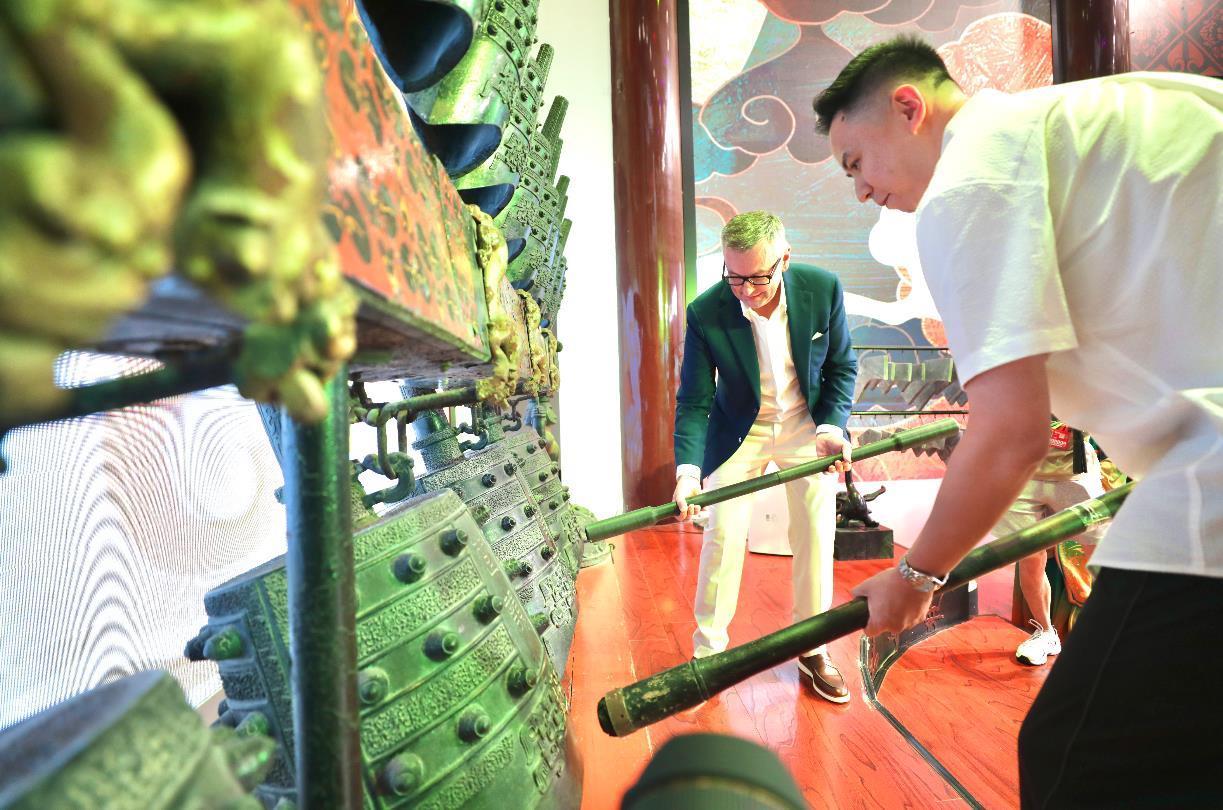 傍晚時分,球員們從楚風園開始此次文化之旅。東湖綠道游人如織,湖風輕拂,水波微漾,自然風光與遠處城市天際線渾然一體。球員們紛紛拿出手機,記錄下這愜意一刻。抵達楚天臺時,正值夕陽西下。球員們步入這座仿古高臺,被其雄渾的楚建筑風格和厚重的歷史氛圍所吸引。隨后,一場精心編排的楚文化文藝表演拉開帷幕。演出中,編鐘演奏的《橘頌》《高山流水》《歡樂頌》等經典曲目回蕩于湖山之間,令人仿佛穿越時空,感受千年文明的脈搏。最讓球員們躍躍欲試的環節是親手敲響編鐘。在工作人員的指導下,世界職業比利與斯諾克協會主席福澤盛、衛冕冠軍肖國棟小心拿起鐘槌,嘗試擊打出清越的音符。