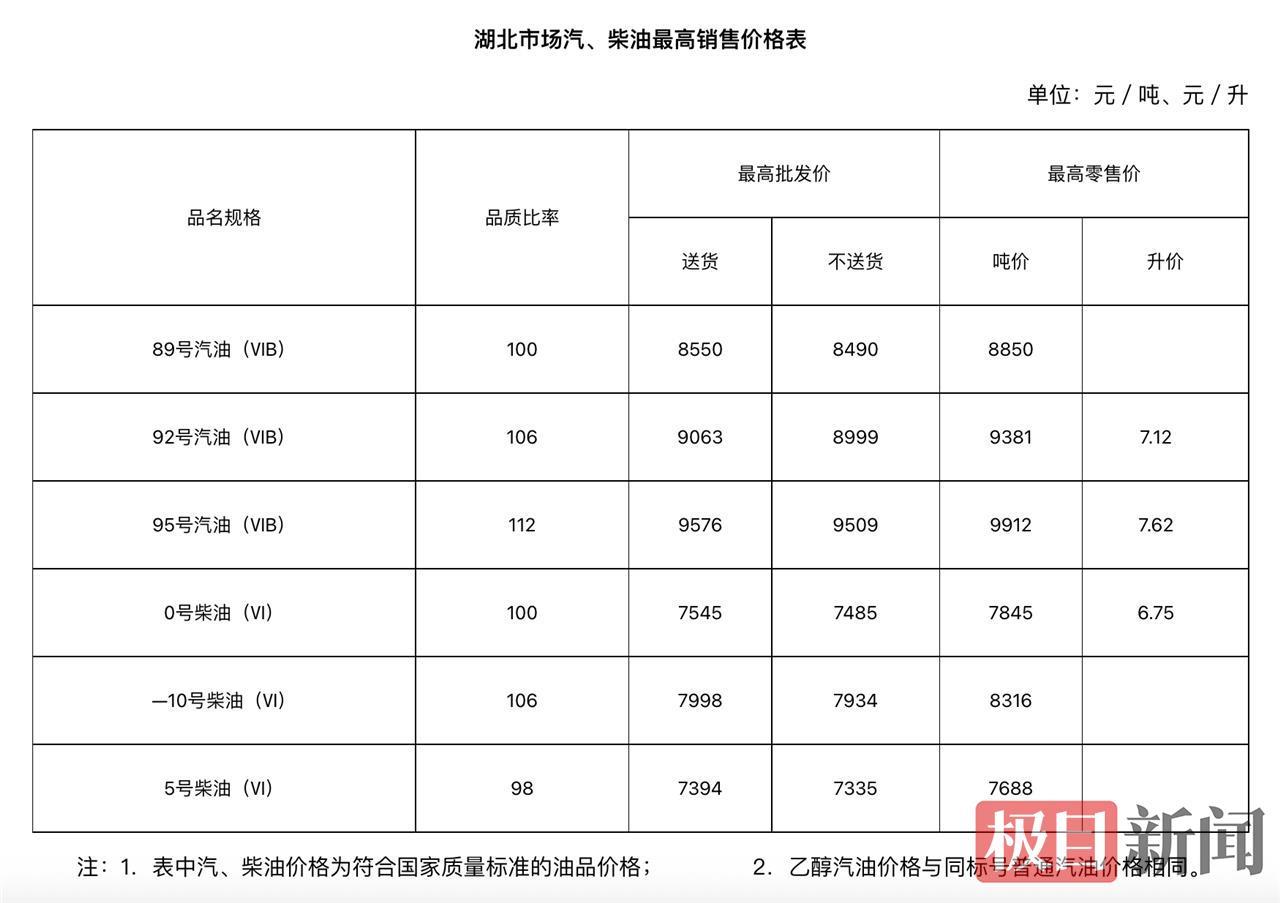 根據近期國際市場油價變化情況和國家發改委調價信息,按照現行成品油價格形成機制,自2025年8月26日24時起,國內汽、柴油價格(標準品)每噸分別下調180元和175元。調價后,湖北汽油、柴油最高零售價格相應調整,92號、95號汽油分別下降至每升7.12元、7.62元,0號柴油降至每升6.75元。