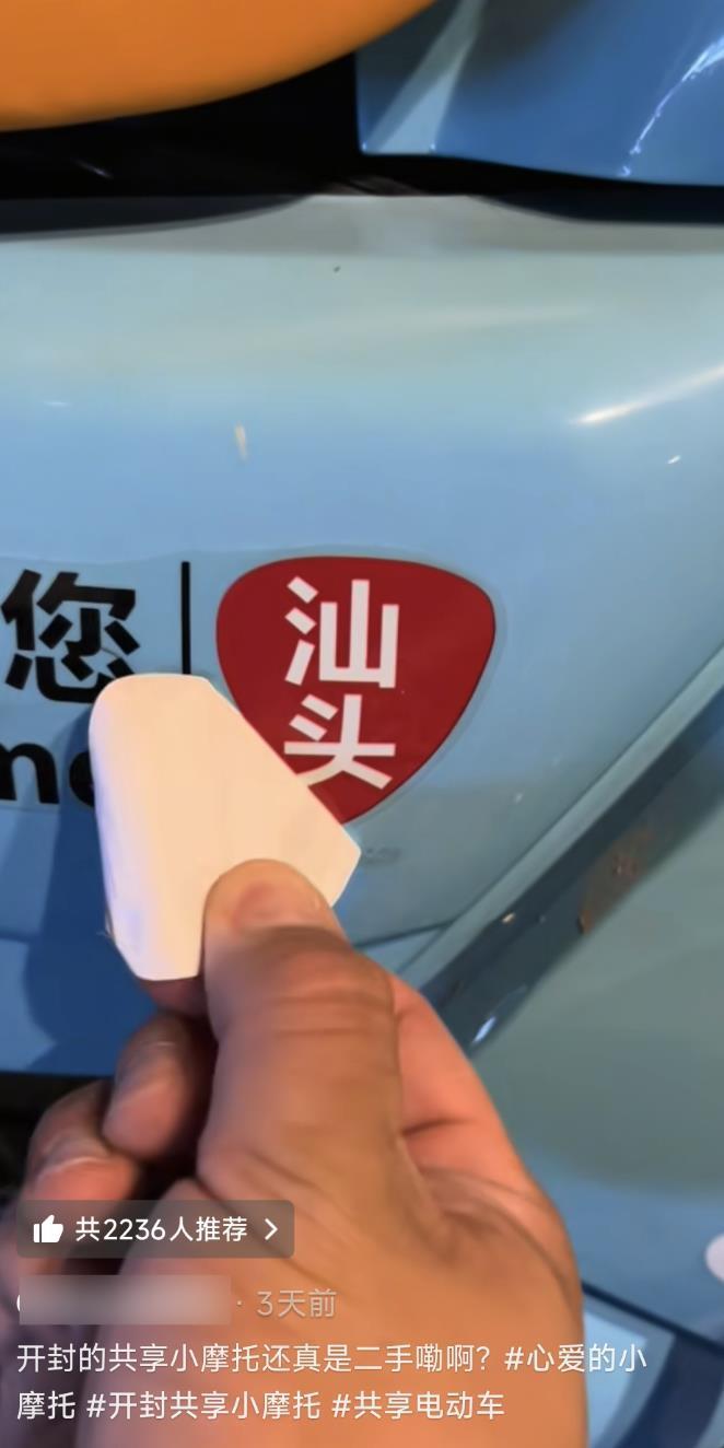 近日,河南開封上新了一批樣式新穎、形似摩托車的共享電單車,不少市民及游客紛紛騎行體驗。不過,有細心網友發現,該共享電單車車身的“開封”標識竟是一張貼紙,揭開后顯示是“汕頭”。不少網友表示,曾在汕頭見過同款車。