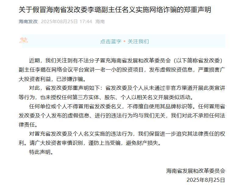 8月25日,海南省發展和改革委員會一則《關于假冒海南省發改委李璐副主任名義實施網絡詐騙的鄭重聲明》引發關注。聲明稱,近期有不法分子冒充海南省發改委副主任李璐在網絡會議平臺宣講投資項目,發布虛假投資信息,嚴重損害廣大投資者利益,已涉嫌詐騙。省發改委及個人從未通過非官方渠道開展此類宣講等行為,也未授權任何第三方實體、股東、個人以相關名義開展類似活動,請廣大投資者審慎識別,謹防上當受騙。