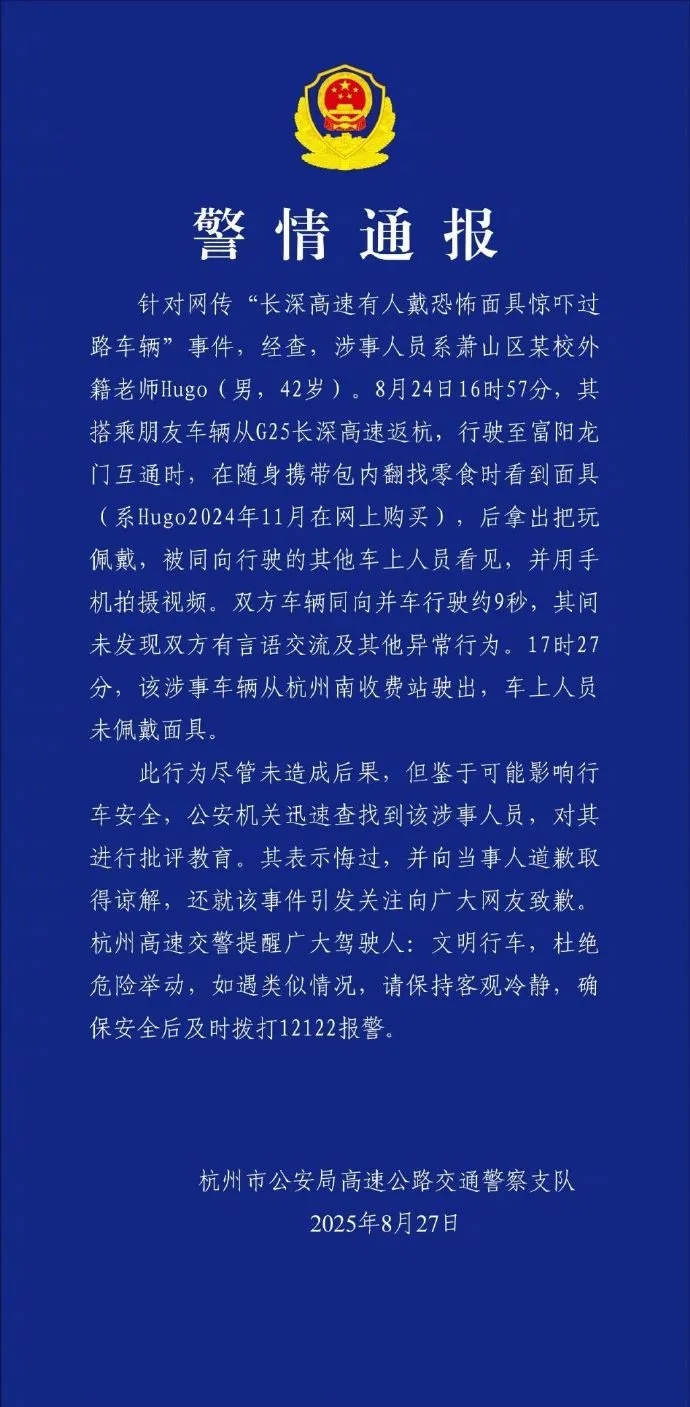 8月27日,杭州市公安局高速公路交通警察支隊針對網(wǎng)傳“長深高速有人戴恐怖面具驚嚇過路車輛”事件發(fā)布警情通報。